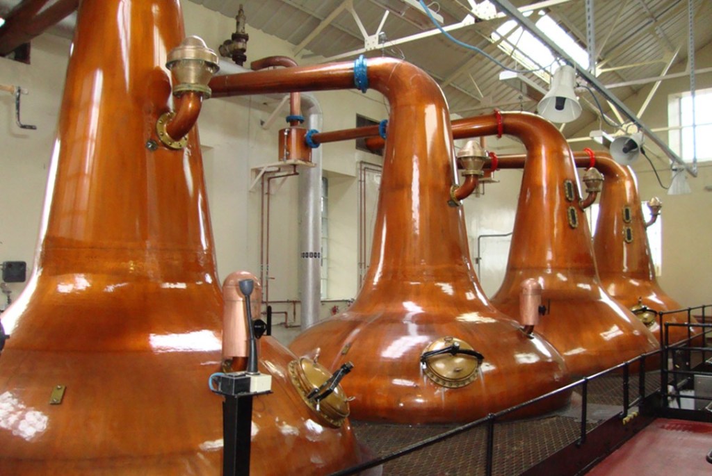 Tipo de alambique: formato de pêra, com gargalos cônicos que se estreitam gradualmente. Os alambiques não têm constrições nem tigelas de refluxo, o que significa que há pouco refluxo durante a destilação.