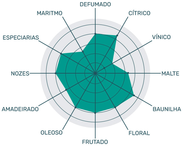 Como é de se esperar de um clássico turfado de Islay, tudo começa com fumaça, que lembra lenha queimada acompanhado de um aroma medicinal iodado leve. Esse é o aroma que persiste nos primeiros minutos e é seguido de camadas de caramelo. A fumaça e o caramelo se fundem com as notas frutadas e trazem aromas que remetem a abacaxi e limão na brasa. Algumas nuances de especiarias como baunilha e noz moscada aparecem de forma discreta.