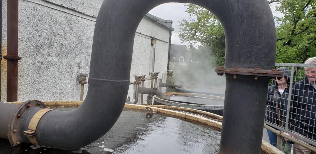 Além disso, todos os alambiques têm Worm Tubs (ou condensadores de serpentina), que são um tipo mais tradicional de sistema de condensação (prometemos falar mais sobre isso em algum momento). São basicamente canos de cobre que ficam em um tanque, geralmente do lado de fora da destilaria, e que fazem o resfriamento dos vapores alcoólicos, trazendo-os novamente para o estado líquido. No caso da Talisker, a água usada para resfriamento das serpentinas é, desde 2018, a água do mar.