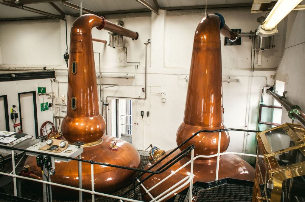 Existem dois alambiques com boil balls no pescoço para aumentar o refluxo. Eles possuem condensadores tipo worm tub, mas de forma incomum, ambos os tubos compartilham o mesmo condensador. “É um pesadelo no verão”, segundo Gordon, pois o calor dificulta a condensação do destilado. Para combater isso, eles têm um condensador tipo shell and tube no bash still instalado antes do worm tub – talvez a única destilaria na Escócia com esse sistema.