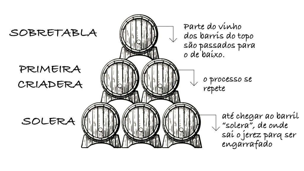 Imagine uma parede com 3 Botas de altura, as mais próximas do chão são conhecidas como Soleras (vem de solo, no espanhol) e é de onde o vinho pronto para consumo vai ser retirado para ser engarrafado.